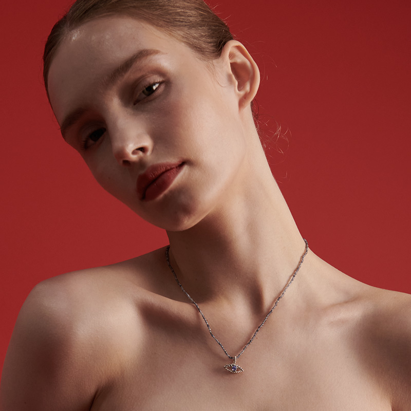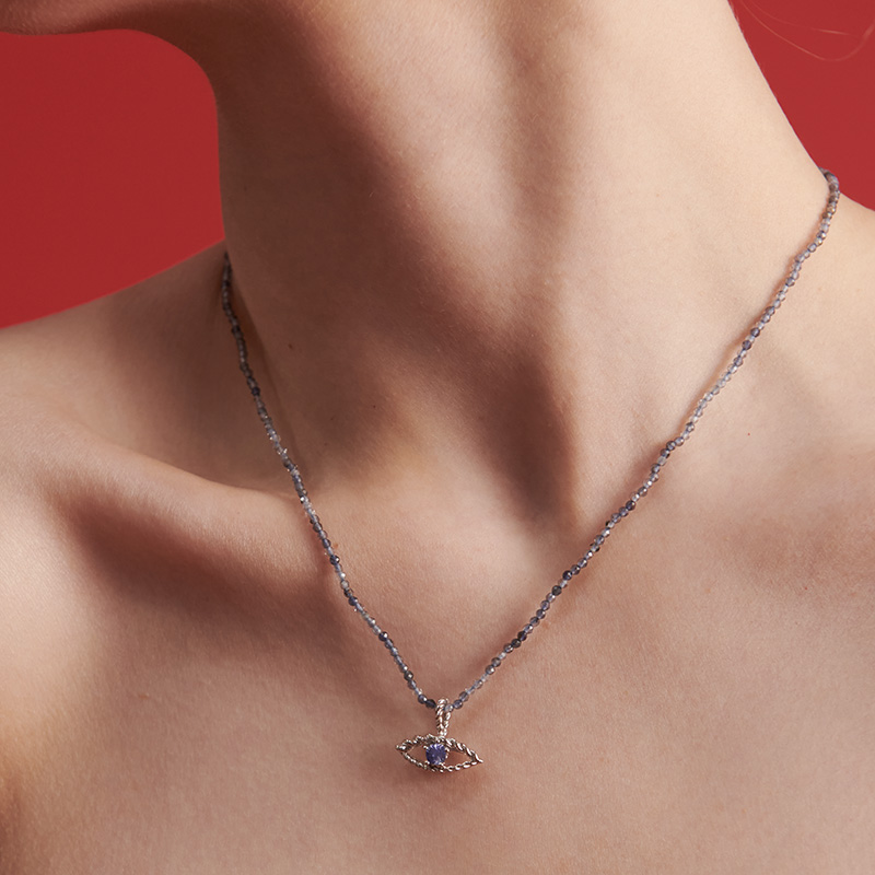 이엘리 작가에게 ‘눈’은 표면적인 것을 넘어, 그 이면의 감정과 생각을 전달하는 매개체를 상징합니다. 연보라색과 회색이 섞인듯 신비로운 탄자나이트가 셋팅된 팬던트는 아이올라이트 비즈와 조화로운 컬러감을 선사합니다. 눈동자는 세상을 바라보는 시각과 감정을 공유하고자하는 작가의 진심 어린 제안을 담고있습니다.