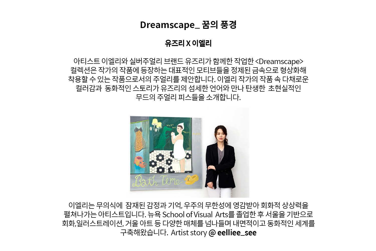 이엘리 작가의 대표적인 모티프인 '몸통-토르소’는 ‘마술적인 모먼트’의 상징입니다. 토르소는 현실에서 꿈으로 가는 통로이자 경계가 무너지는 문이며, 상상 속 세계의 문을 여는 열쇠가 됩니다.꿈속 풍경처럼 펼쳐지는 인체형상은 인생의 사랑과 애정, 꿈과 희망을 가장 먼저 느끼는 감각기관으로서 작가의 판타지컬한 상징들입니다.