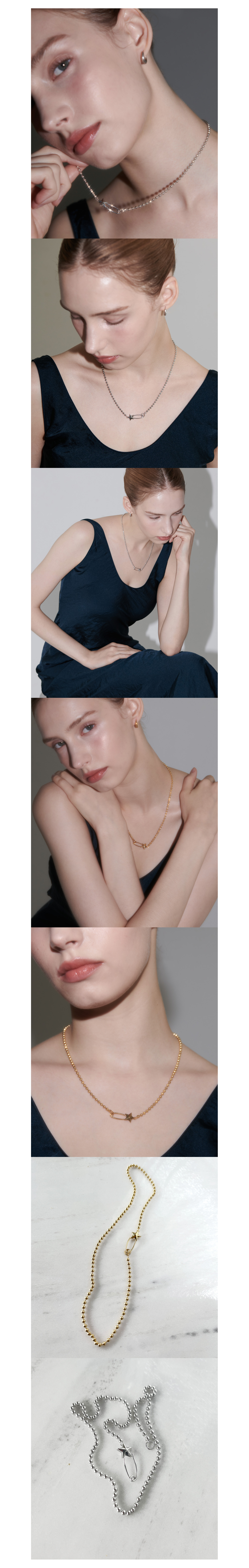 옷핀의 구조와 별 형태를 결합해 탄생한 특별한 잠금장식이 매력적인 네크리스입니다. 착용자이 움직임에 따라 자연스럽게 흔들리는 볼체인이 천체의 신비로움과 끊임없는 변화를 표현합니다.