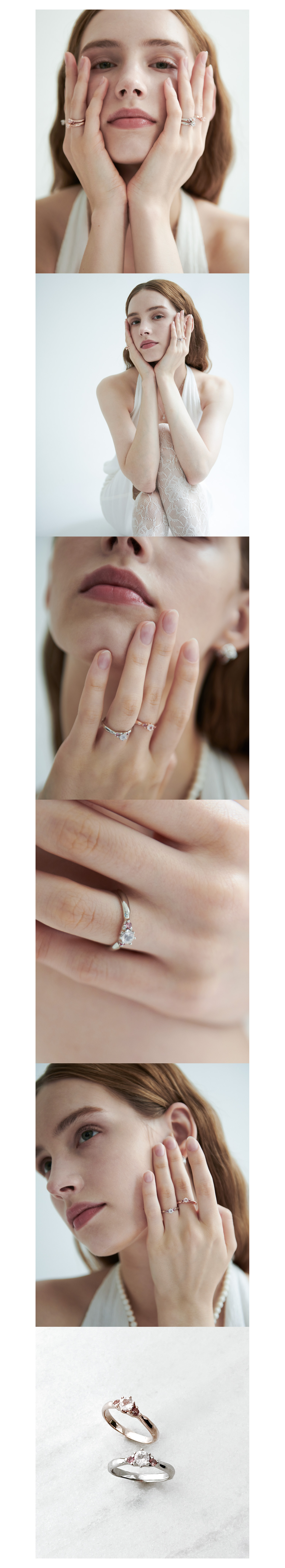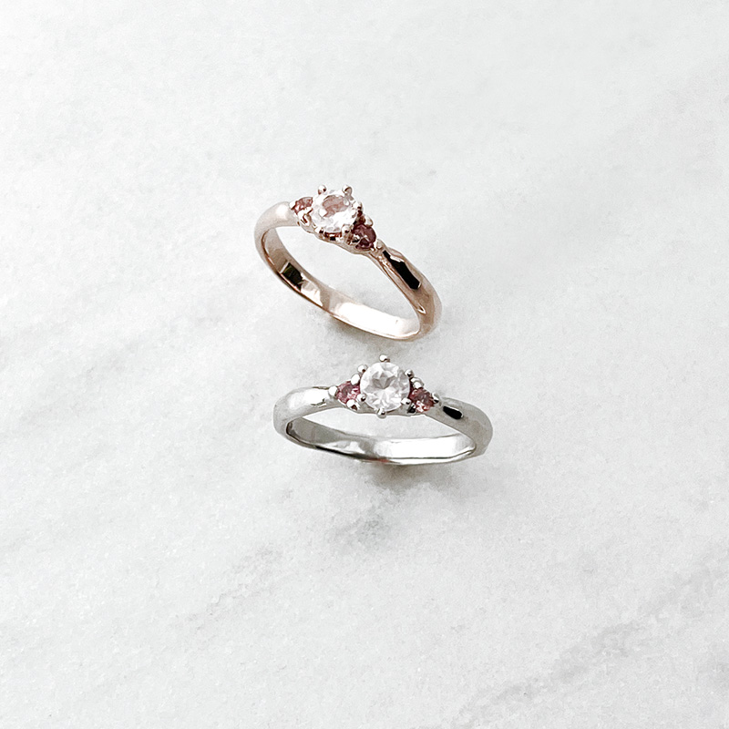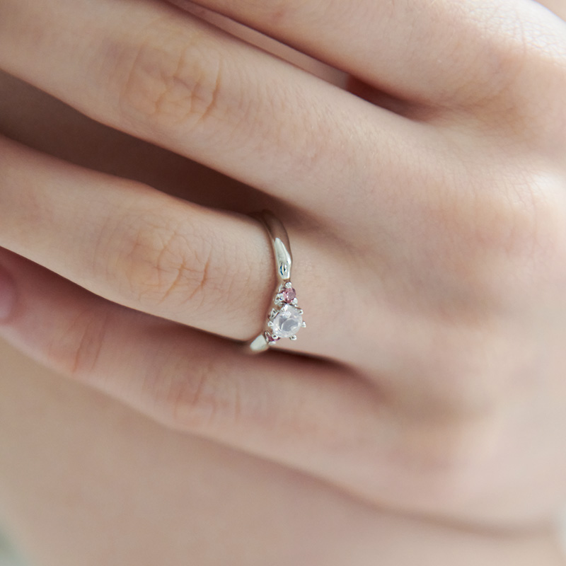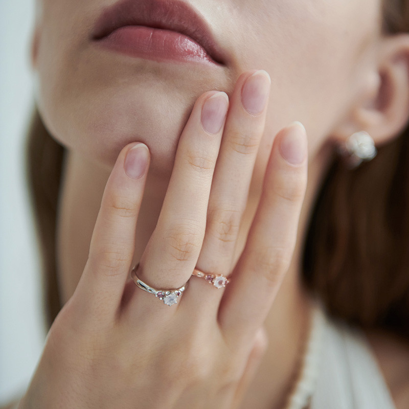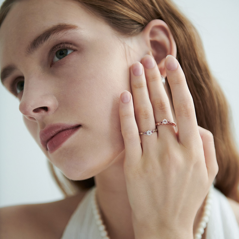 시작은 언제나 설레는 순간입니다. 봄처럼 다가오는 새로운 시작의 즐거움과 순수함을 핑크빛 스톤으로 표현했습니다 은은한 로즈 쿼츠를 메인 스톤으로, 핑크 투어말린을 사이드 스톤으로 배치해 부드럽고 로맨틱한 분위기를 담았습니다.